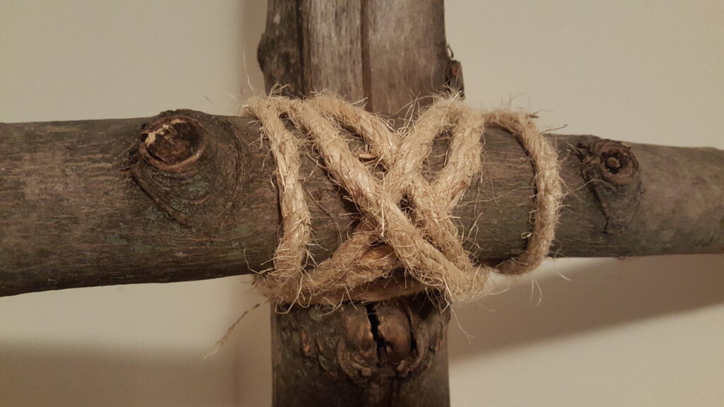 - I took some fallen maple branches from our yard that God provided and I cut them to make the shaft and crossbar for a cross about 5.5′ high and 3′ wide. I carved some notches in the pieces to help them fit together, and I got some sisal rope from Menards for $4 to tie them together. If needed, I can easily disassemble it for compact storage when not in use, but in practice I just keep it tied together and propped up behind our garage freezer. (It can be used at other times of year as desired too, like to decorate your yard for All Saints Eve.)
